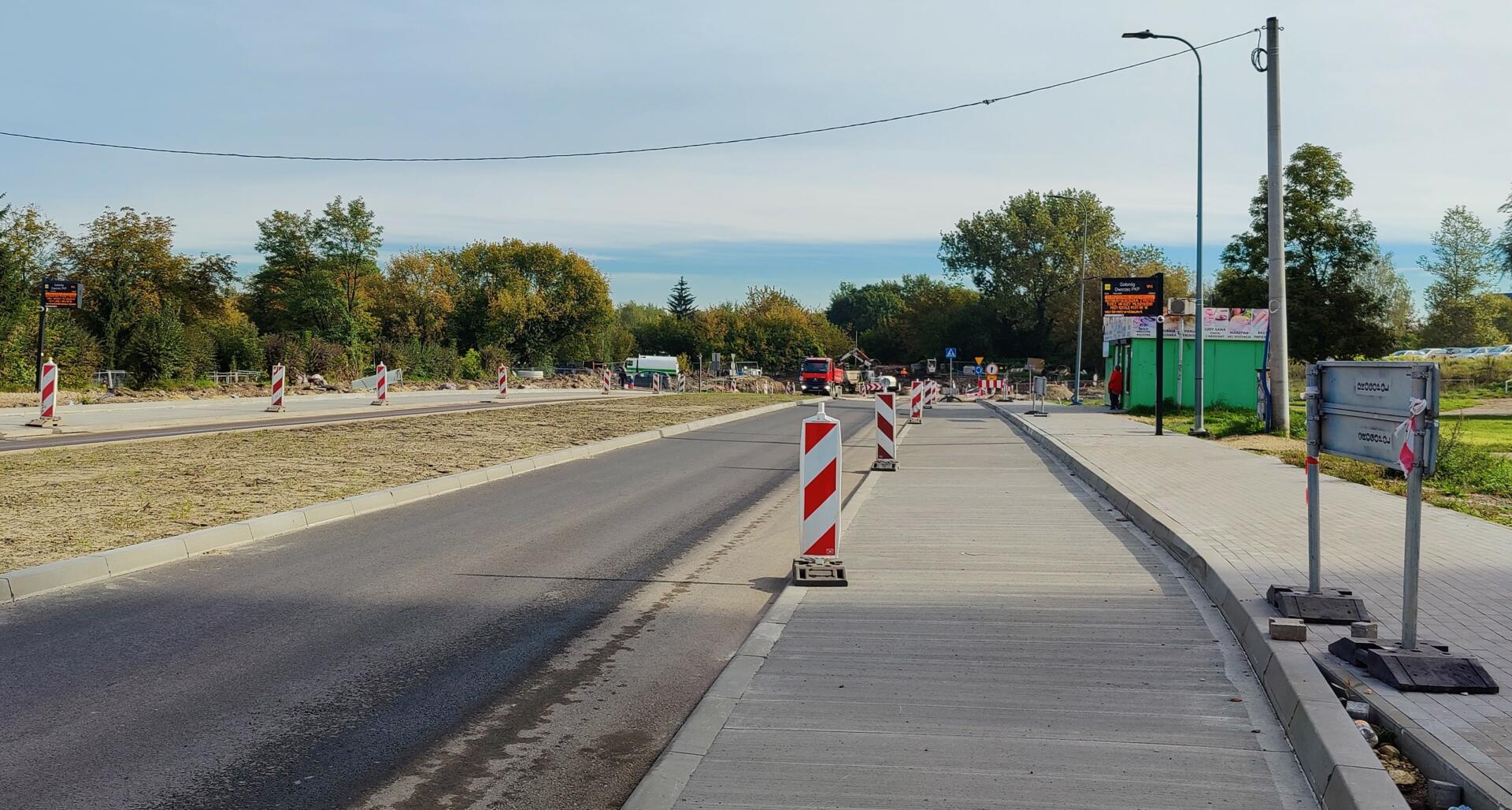 – Na docelowych peronach [zdjęcie poniżej] autobusy będą mogły zatrzymywać się po pełnym stężeniu betonu w nowych zatokach i wybudowaniu chodnika po stronie dworca – mówi Samuel Tomczyk z firmy Drogopol, która prowadzi prace drogowe w al. Zagłębia Dąbrowskiego i na ul. Uklańskiego.
