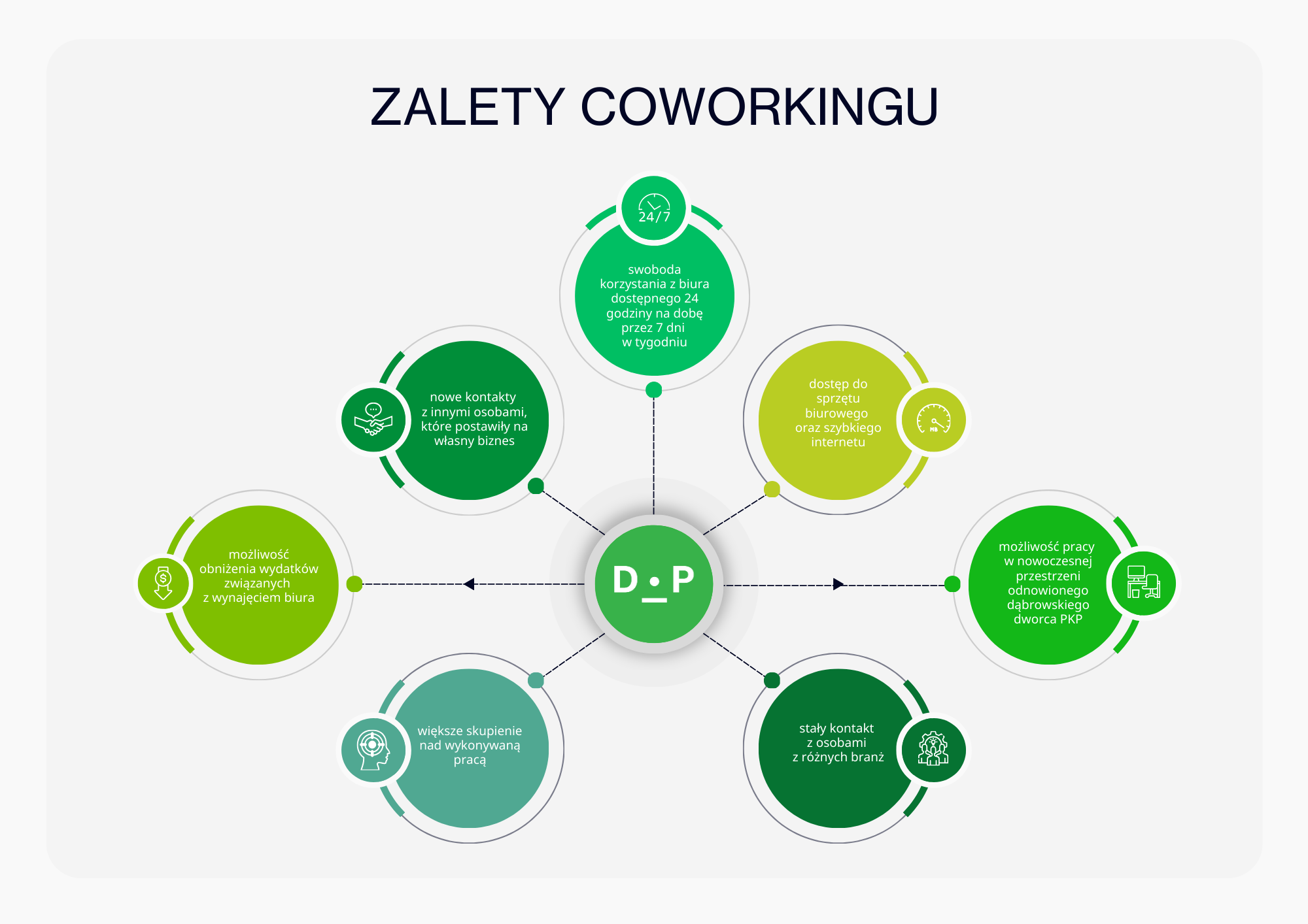 - Swoboda korzystania z biura dostępnego 24 godziny na dobę, 7 dni w tygodniu.