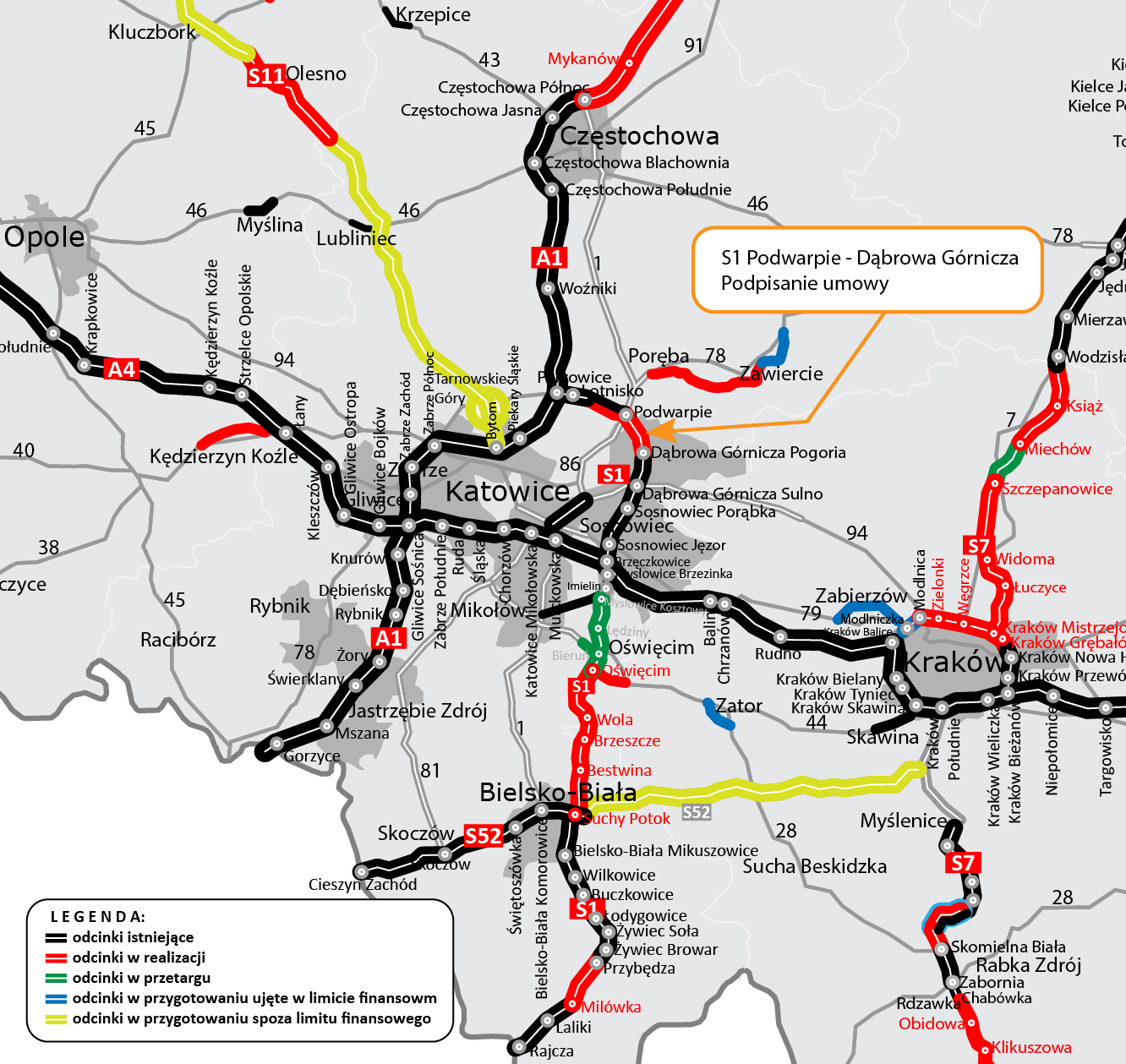 Aby dokończyć całą arterię, potrzebne jest zakończenie budowy drugiej jezdni wysuniętego najdalej na północ odcinka S1 Lotnisko – Podwarpie, budowa nowej obwodnicy Węgierskiej Górki, wybudowanie po nowym śladzie drogi ekspresowej S1 Mysłowice – Bielsko-Biała. 14 maja GDDKiA podpisała umowę na budowę odcinka od węzła Oświęcim (z węzłem) do Dankowic, a 3 sierpnia umowę na budowy odcinka od Dankowic do Bielska-Białej. Rozstrzygnięcie przetargu dla północnego odcinka biegnącego od Mysłowic do Oświęcimia ma nastąpić wkrótce.