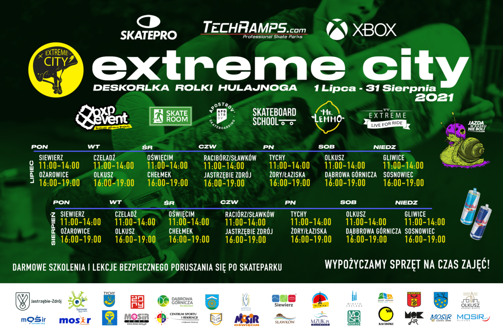 Dodatkowo, dla fanów skateparku w Parku Zielona, który musiał zostać niedawno zdemontowany, w Centrum Sportu i Rekreacji przy ul. Letniej 9 stanął Pumptrack firmy Techramps, który przez całe wakacje będzie za darmo dostępny dla każdego w godzinach otwarcia obiektu. W tym miejscu odbędą się też Szkolenia Jazdy na Pumptracku prowadzone przez ekipę Extreme City oraz Skate Room w dniach: