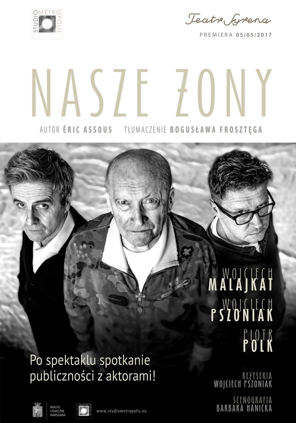 „Nasze żony” to sztuka, w której aktor jest na pierwszym planie, jest podmiotem, a nie – jak to się dziś często zdarza – przedmiotem. Lubię taki teatr. Taki teatr jest mi bliski. Interesują mnie ludzkie losy, zmaganie się człowieka z życiem. Nie chcę, by coś przeszkadzało mi w zbliżeniu się do człowieka, w jego zrozumieniu. Wybrałem tę sztukę również dlatego, żeby spotkać się na scenie z moimi wspaniałymi Kolegami – Wojtkiem Malajkatem i Jurkiem Radziwiłowiczem – mówi Wojciech Pszoniak.