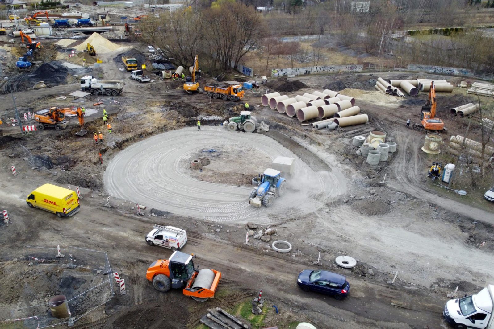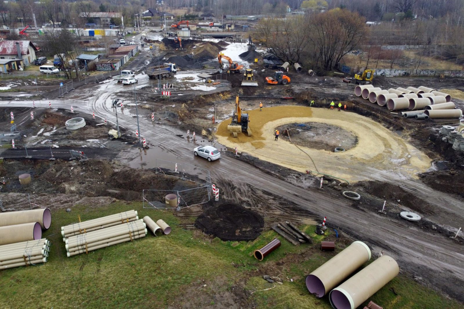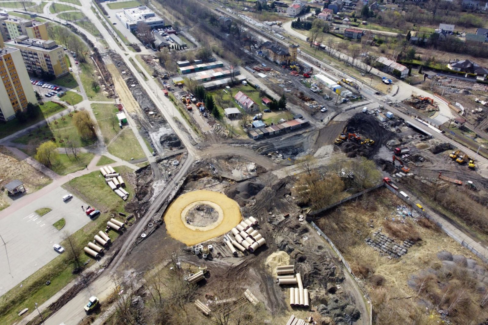 Zgodnie z zapowiedziami, dobrze już widoczna tarcza ronda została ulokowana w docelowym obniżeniu terenu, czyli 1,5 m poniżej obecnego poziomu jezdni ul. Uklańskiego i alei Zagłębia Dąbrowskiego.