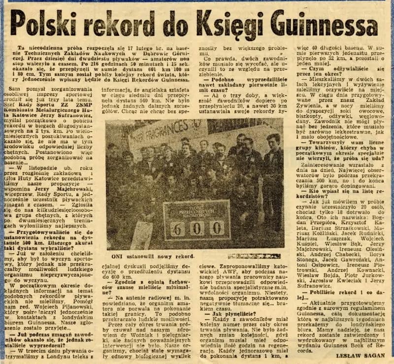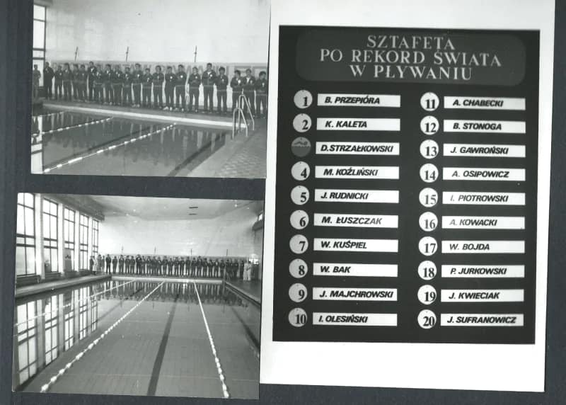 W lutym 1987 roku grupa dwudziestu mężczyzn z Dąbrowy Górniczej podjęła próbę przepłynięcia rekordowego dystansu w sztafecie. Bez przerwy przez 9 dni i nocy pływali w basenie Technicznych Zakładów Naukowych. Zawodnicy pływali na zmianę, każdy po 1000 metrów. Przerwy między zmianami wynosiły około siedmiu godzin, w tym czasie pływacy mogli odpocząć, spać oraz jeść. Dystans, jaki udało im się pokonać, wyniósł dokładnie 601,180 kilometrów. Ten wynik oznacza, że uczestnicy sztafety przepłynęli ponad 24 tysiące długości basenu i pobili Rekord Guinessa.