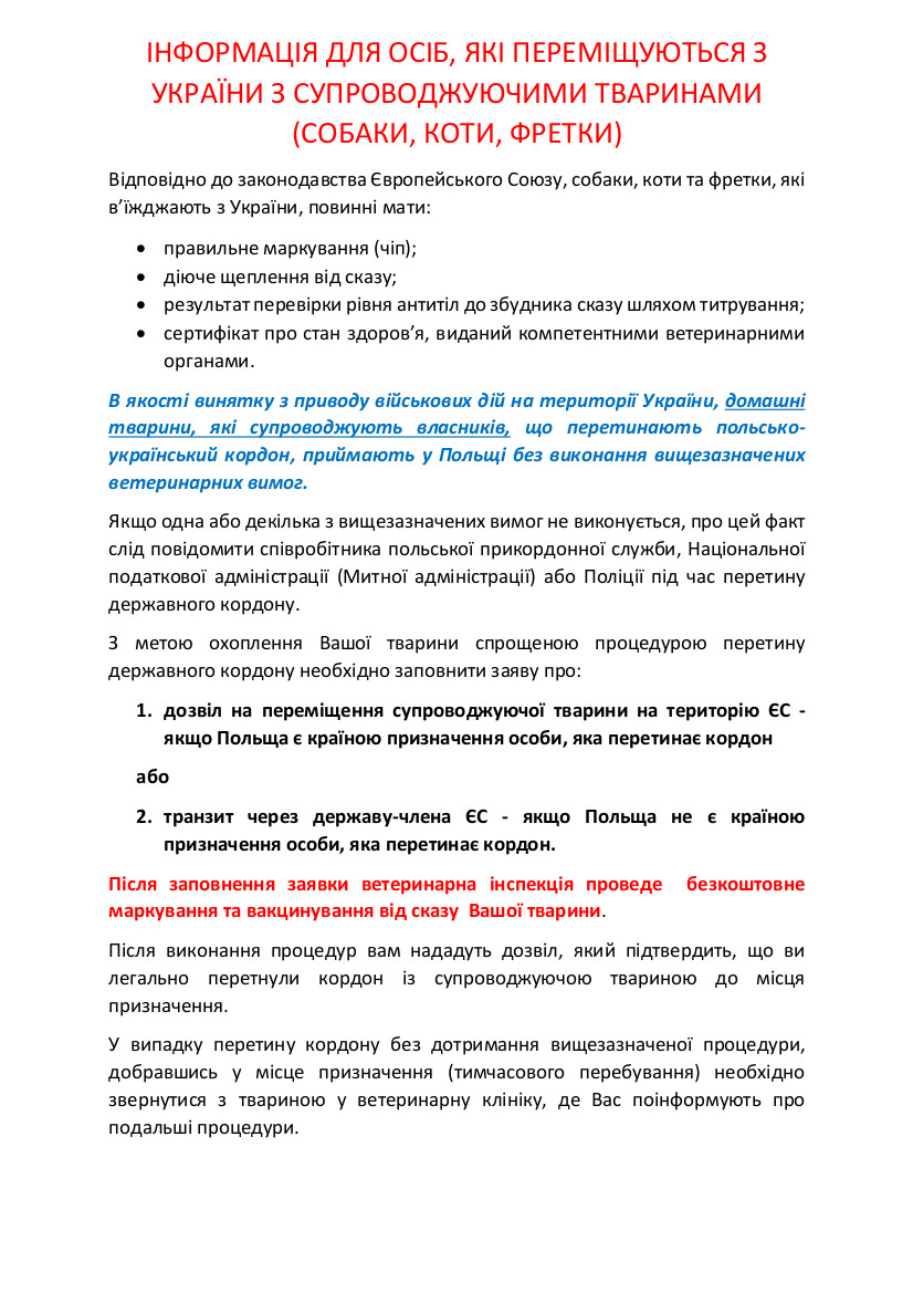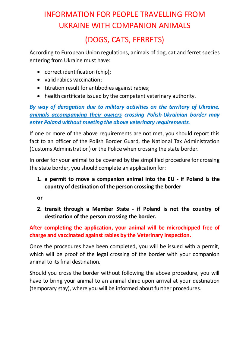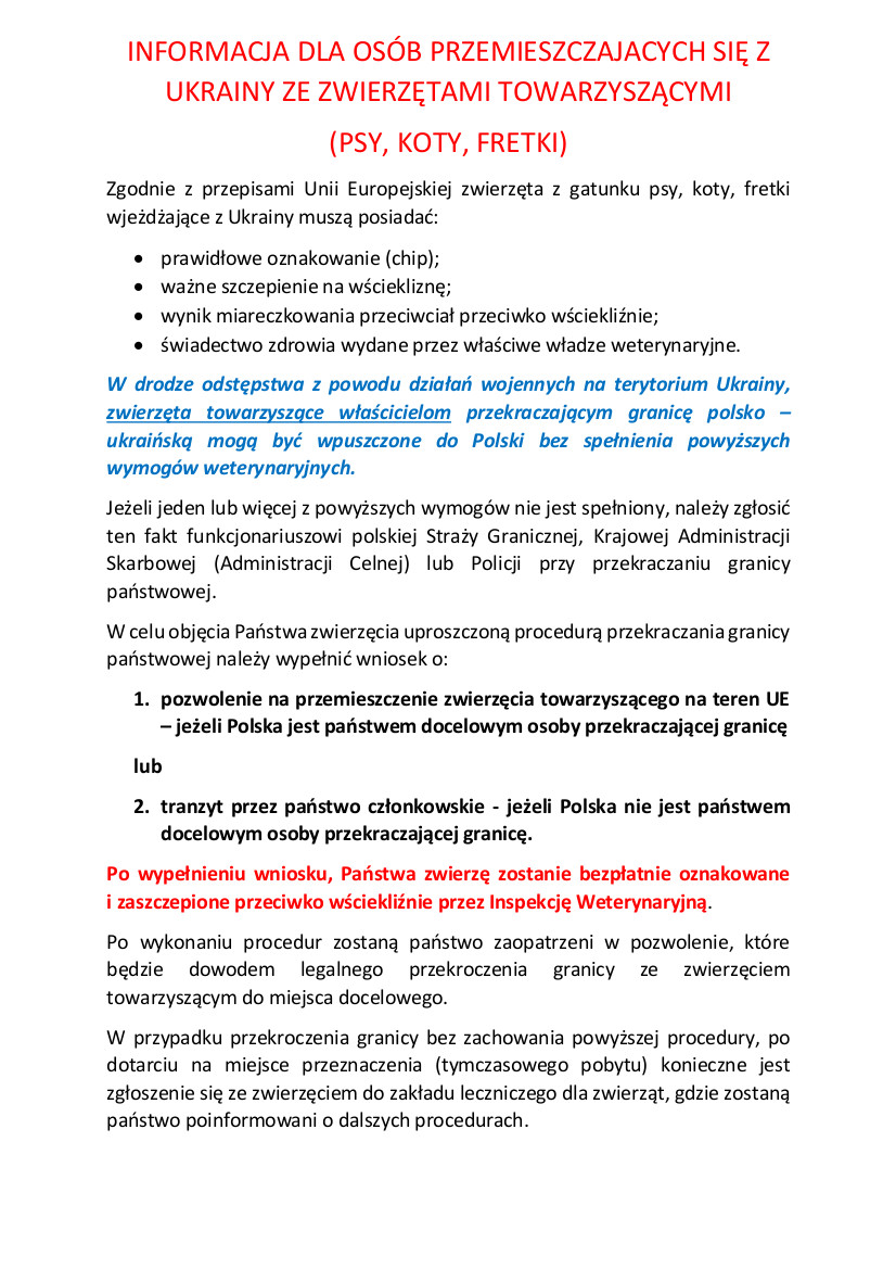 INFORMACJA DLA OSÓB PRZEMIESZCZĄJCYCH SIĘ Z UKRAINY ZE ZWIERZĘTAMI