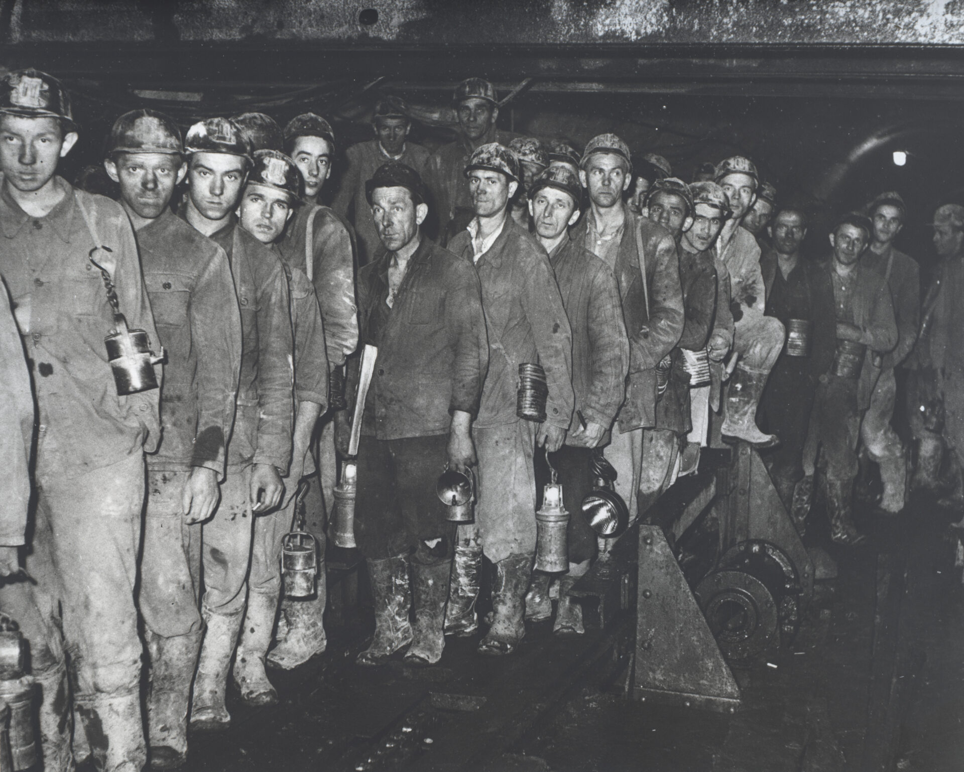 Górnicy kopalni Mortimer-Porąbka z lampami karbidowymi i elektrycznymi, lata 60. XX w., zbiory Muzeum Miejskiego „Sztygarka”