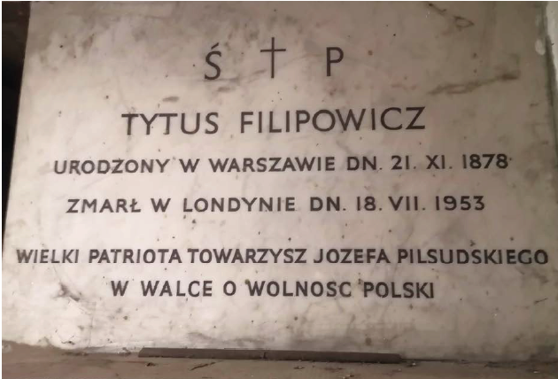 W listopadzie 1918 roku, pełniąc obowiązki Ministra Spraw Zewnętrznych w rządzie Jędrzeja Moraczewskiego, podpisał wraz z Naczelnikiem Państwa Józefem Piłsudskim depeszę notyfikującą powstanie niepodległego państwa polskiego. W 1919 roku jako obserwator wziął udział w konferencji pokojowej w Wersalu. W latach międzywojennych pełnił kolejno funkcje: przewodniczącego „Misji specjalnej na Kaukaz Południowy”, chargé d’affaires w Rosji, posła w Finlandii, posła w Belgii, posła, a następnie ambasadora w USA oraz posła w Meksyku. Po II wojnie światowej Tytus Filipowicz osiadł na emigracji. Zmarł w Londynie 18 lipca 1953 roku i został pochowany w katakumbach kaplicy pod wezwaniem św. Marii na katolickim cmentarzu Kensal Green. Dzięki poszukiwaniom przeprowadzonym przez Andrzeja Kotuleckiego udało się pozyskać do Muzeum fotografie grobu zasłużonego Polaka i dąbrowiaka, które prezentujemy.