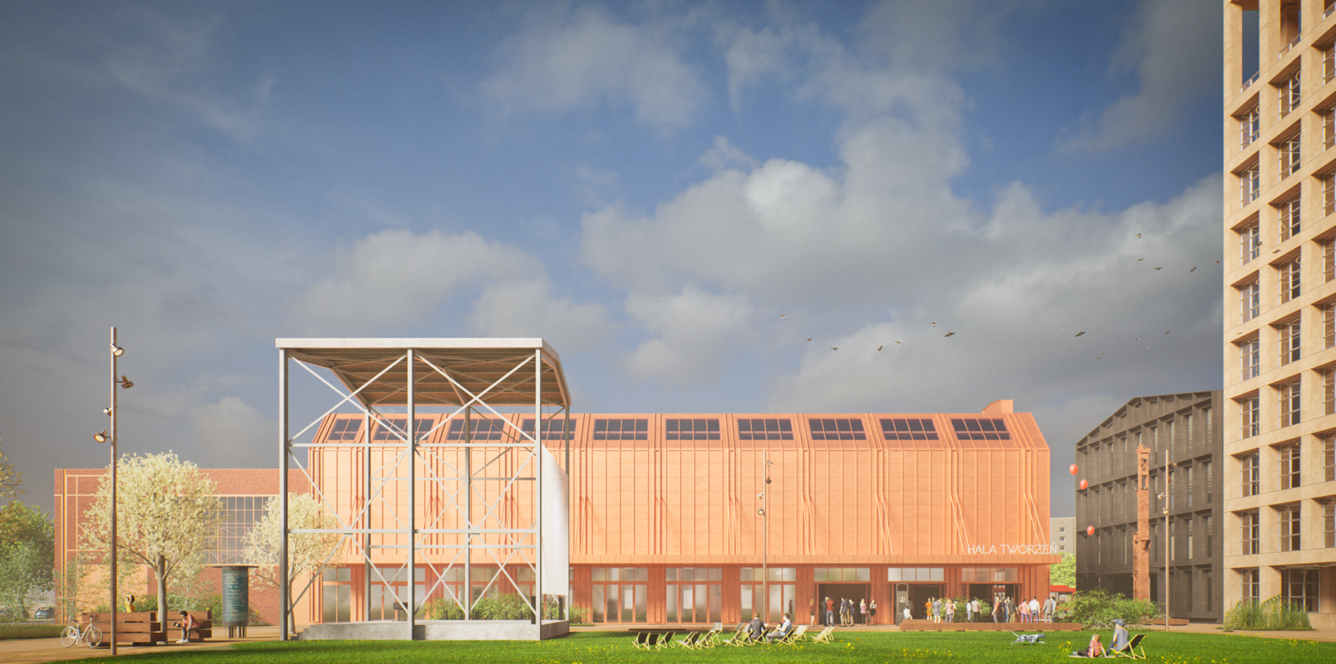 Nowe centrum Dąbrowy Górniczej – wizualizacja Hali Tworzeń od strony Zielonego Rynku. Znajdzie się tutaj nowoczesna przestrzeń konferencyjno-targowo-koncertowa. Na pierwszym planie widać scenę plenerową, której konstrukcja będzie pochodziła ze starych filarów