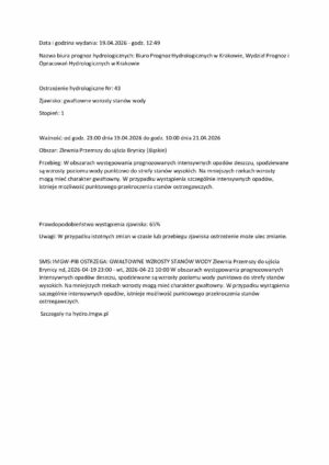 2026-04-19 Ostrzeżenie hydrologiczne nr 43 gwałtowne zrosty stanów wody PRZEMSZA, SOŁA.