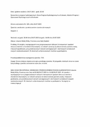 2025-07-28 Ostrzeżenie hydrologiczne nr 185 – wezbranie z przekroczeniem stanów ostrzegawczych (zlewnia Małej Wisły, Przemszy, Soły)3 zmiana