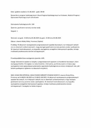 2025-08-01 Ostrzeżenie hydrologiczne nr 199 – gwałtowne wzrosty stanów wody (Mała Wisła, Przemsza)1