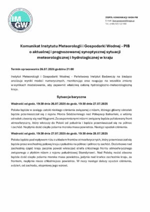 Komunikat IMGW -PIB o aktualnej i prognozowanej synoptycznej sytuacji meteorologicznej i hydrologicznej w kraju