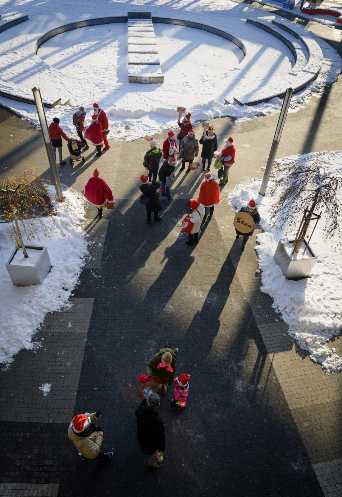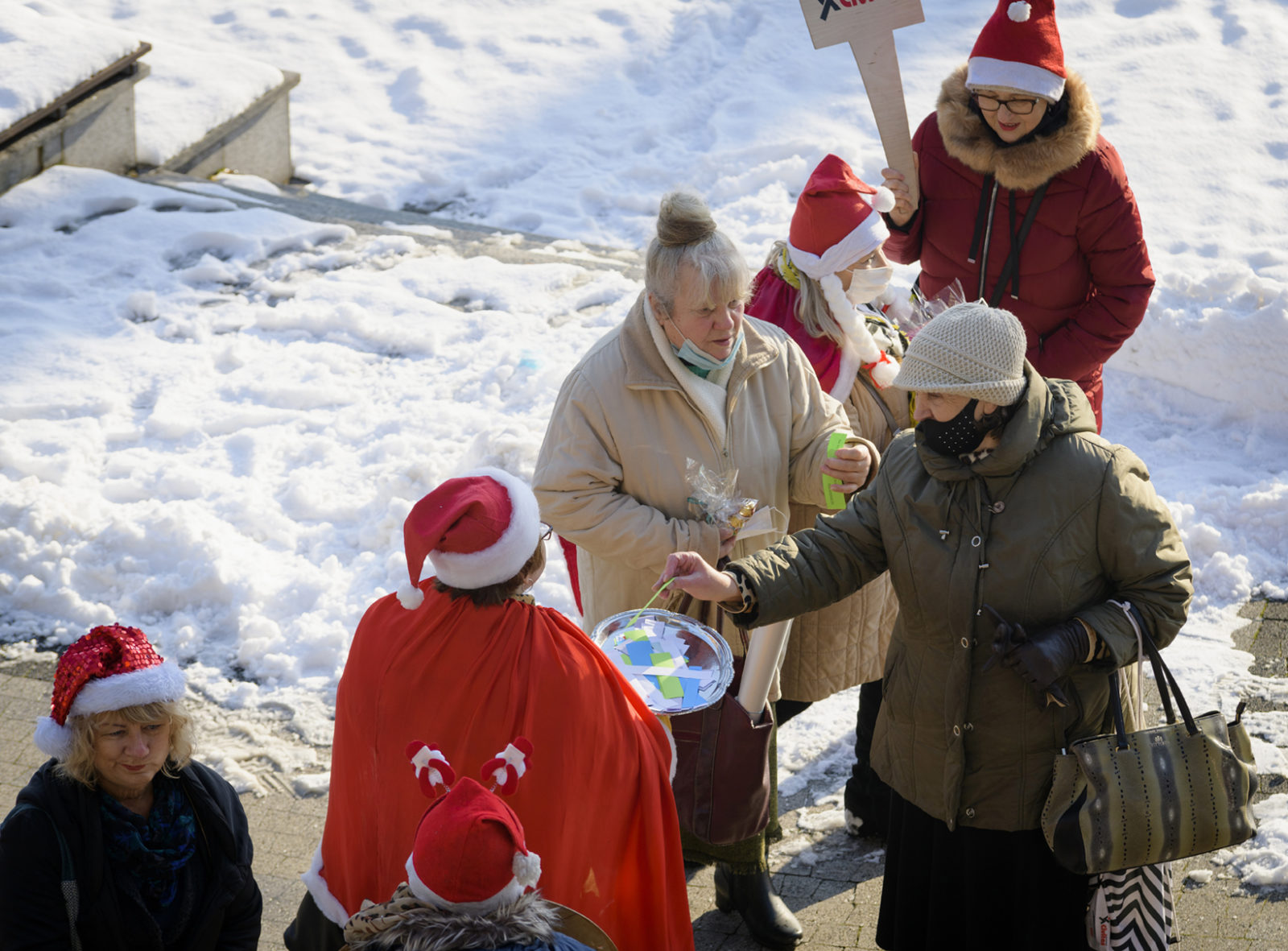 poszukiwanie dziecka w nas: każdy opowiada Mikołajom o swoich marzeniach i życzeniach, ze „Słoja dobrych myśli” odczytuje sentencję i otrzymuje mikołajkowy upominek niezależnie od wieku – happening stowarzyszenia Civitas. Fot.: Marek Wesołowski