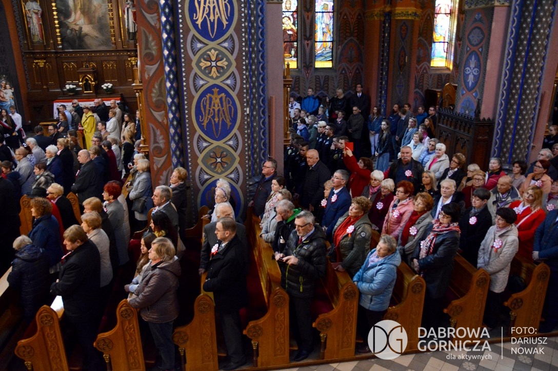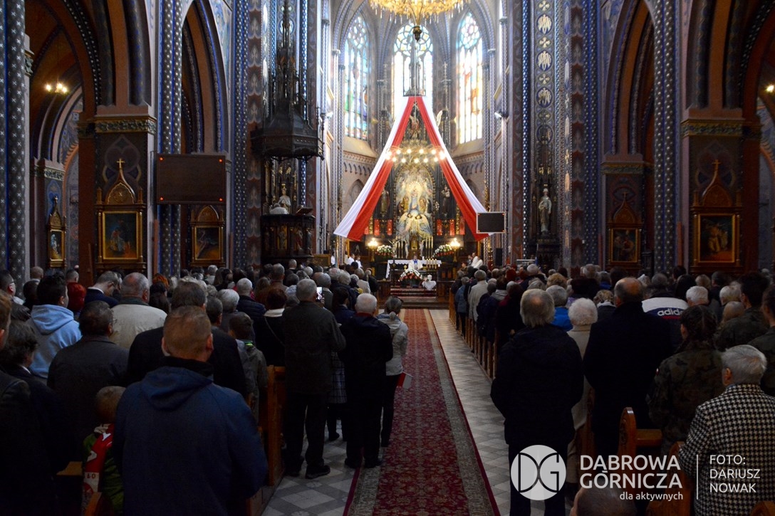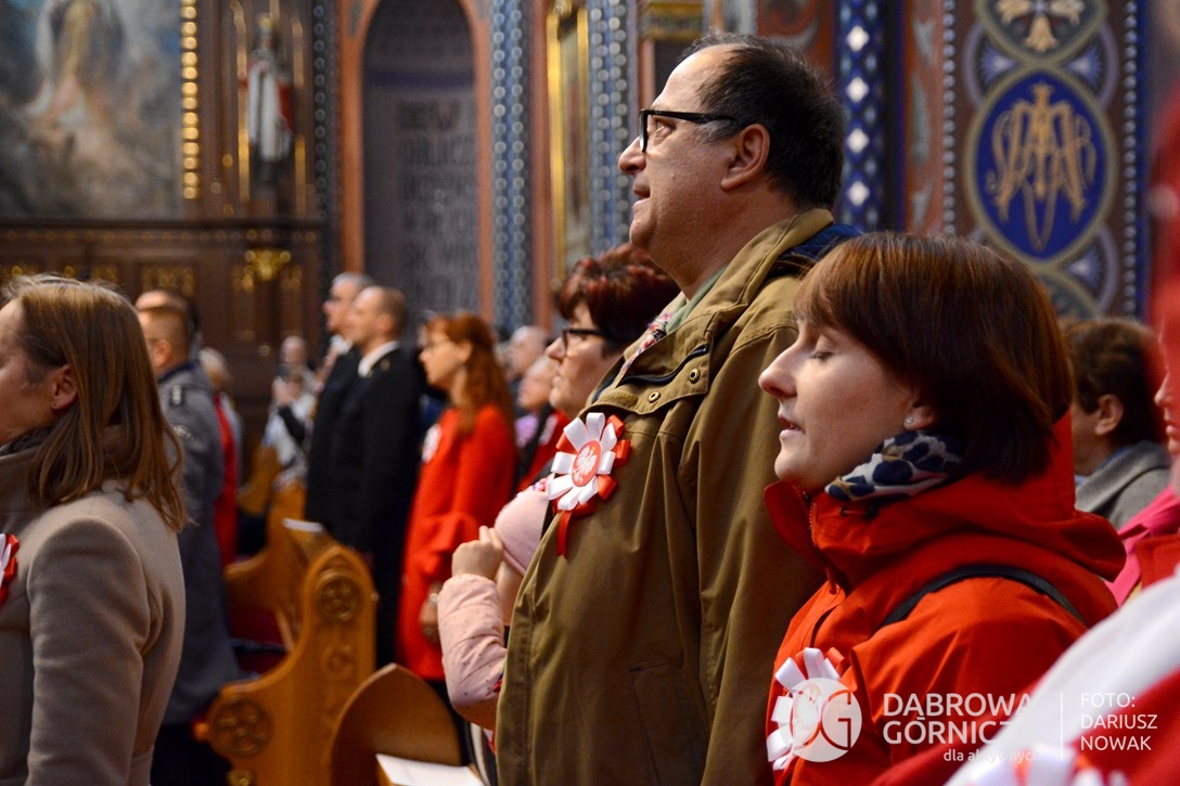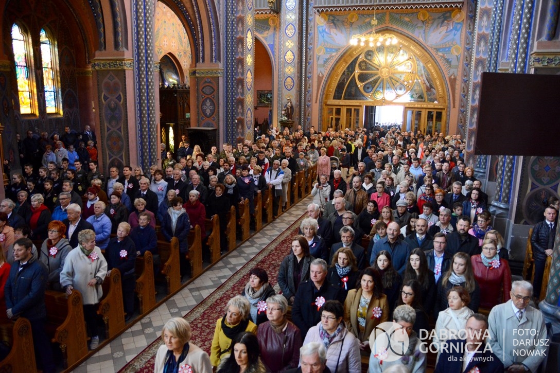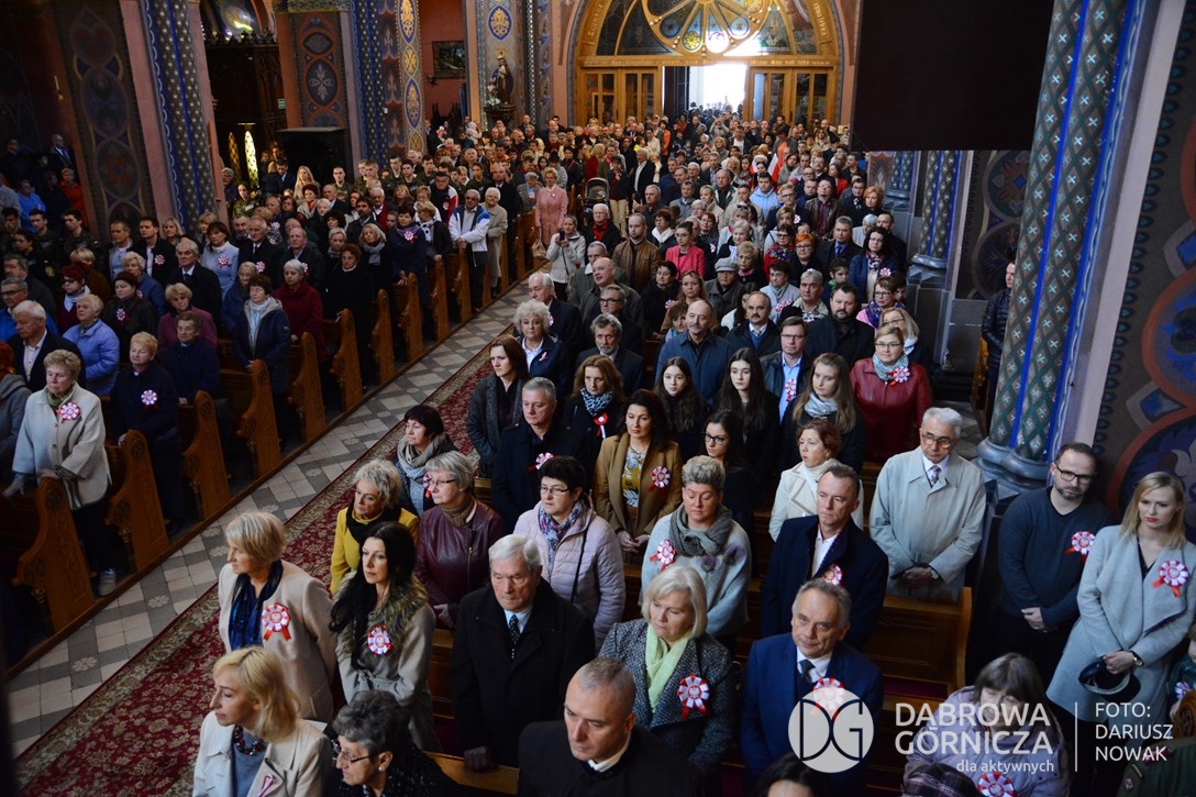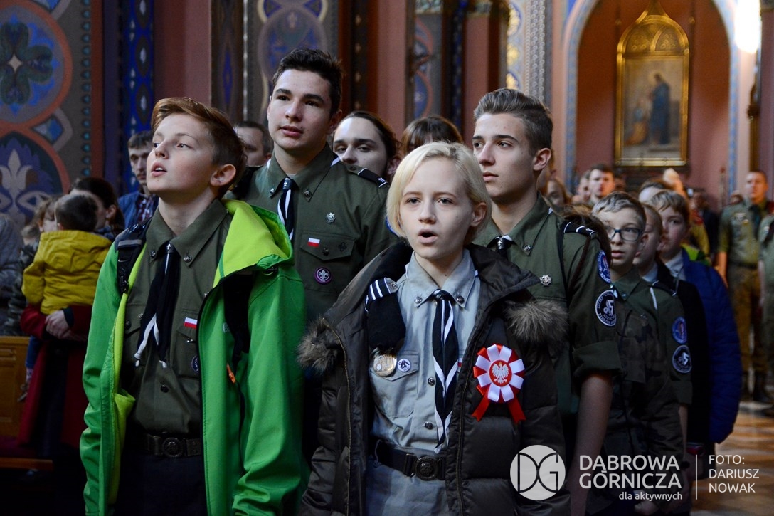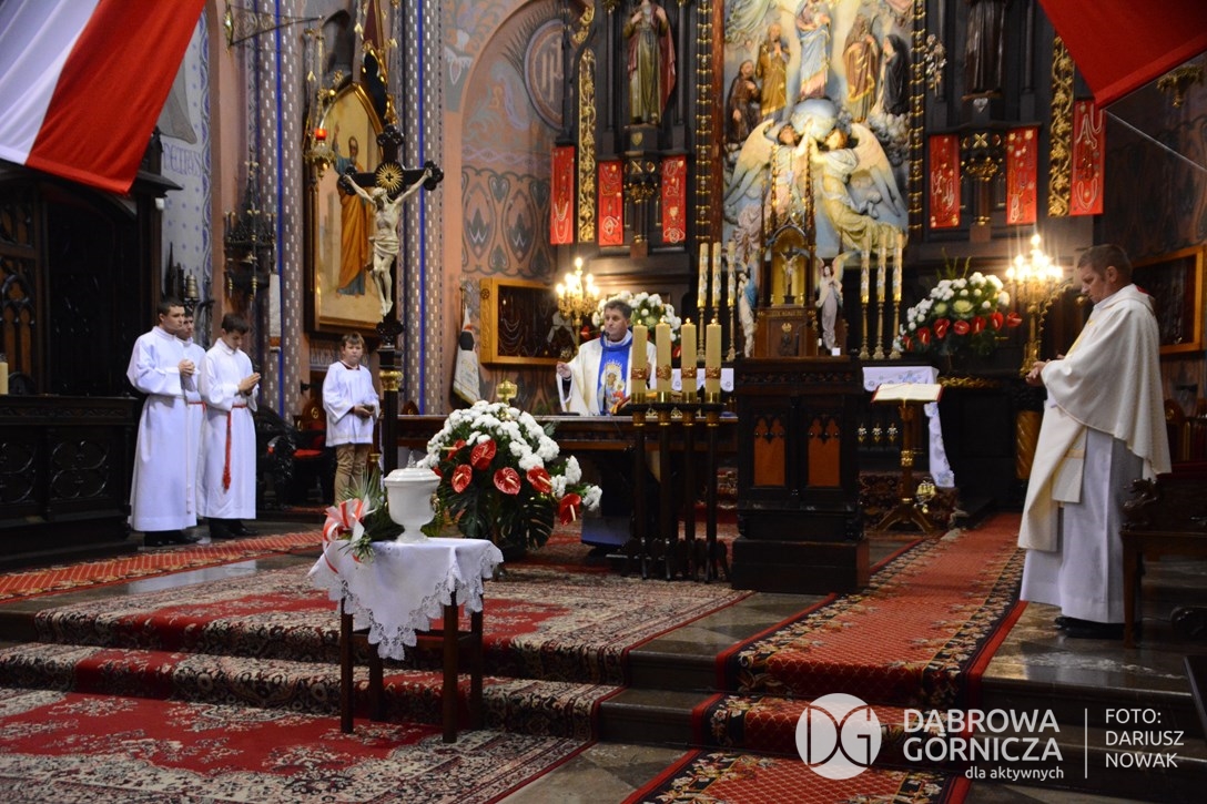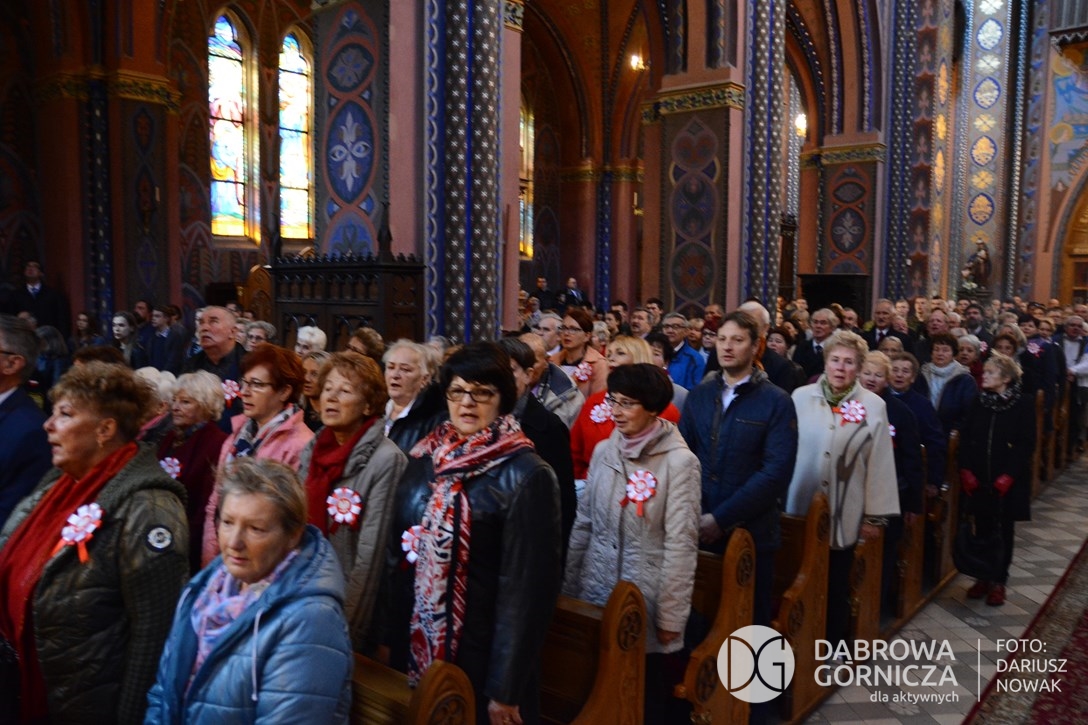 2018.11.11 Dąbrowa dla Niepodległej. Uroczysta msza w Bazylice, kwiaty na Placu Wolności, Ognisko patriotyczne i inne. FOTO: Dariusz Nowak (nddg)