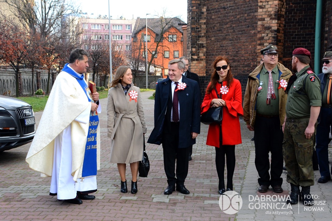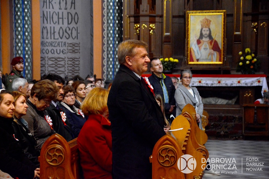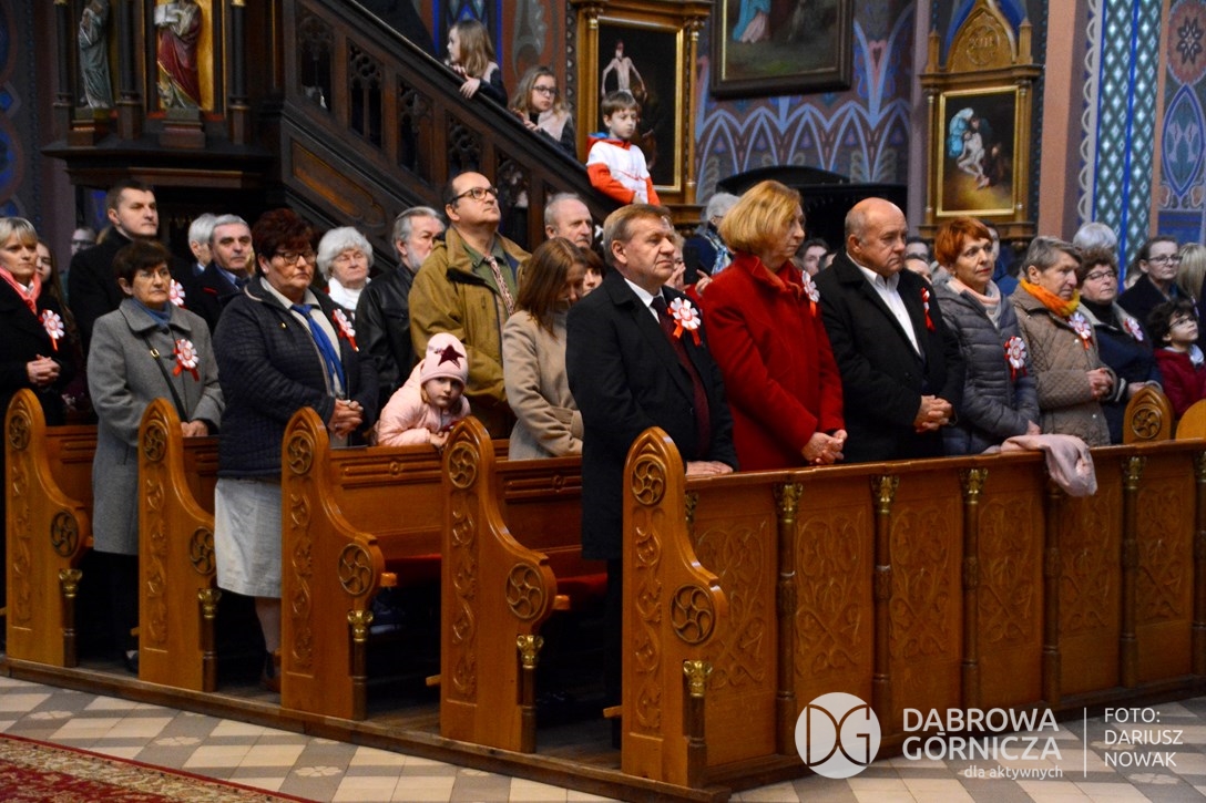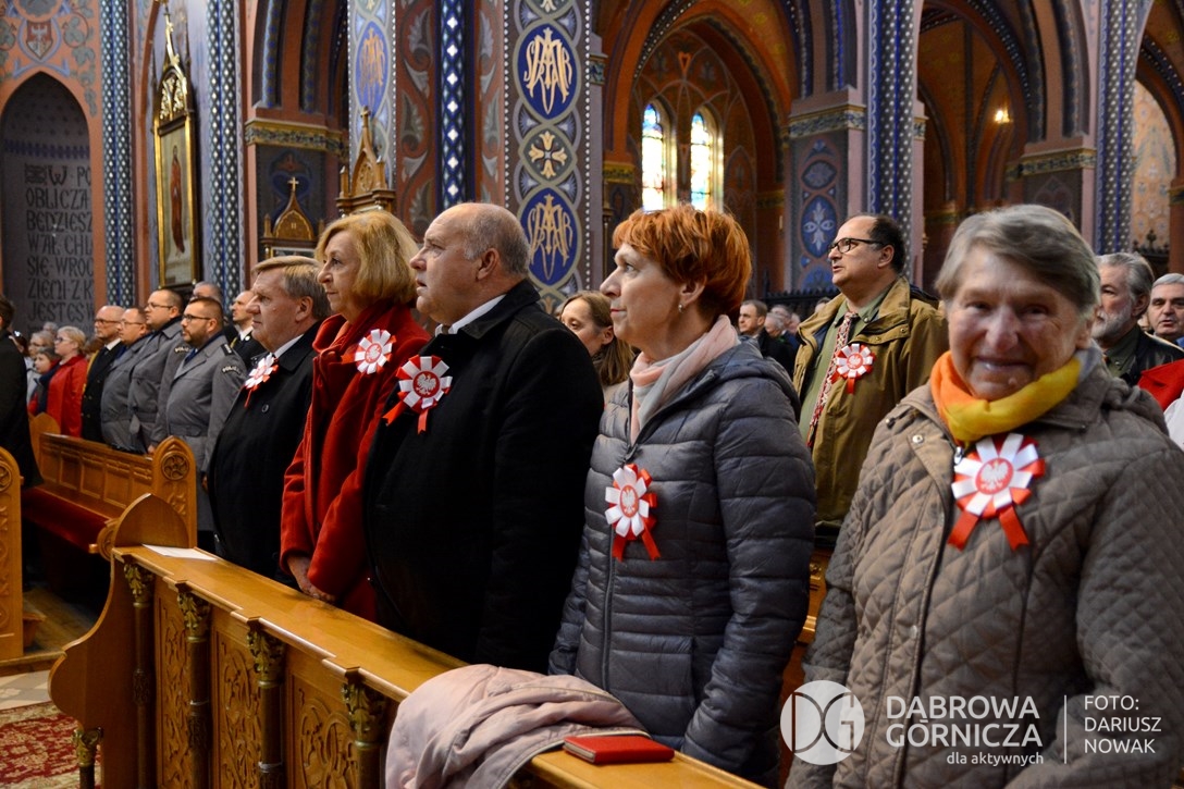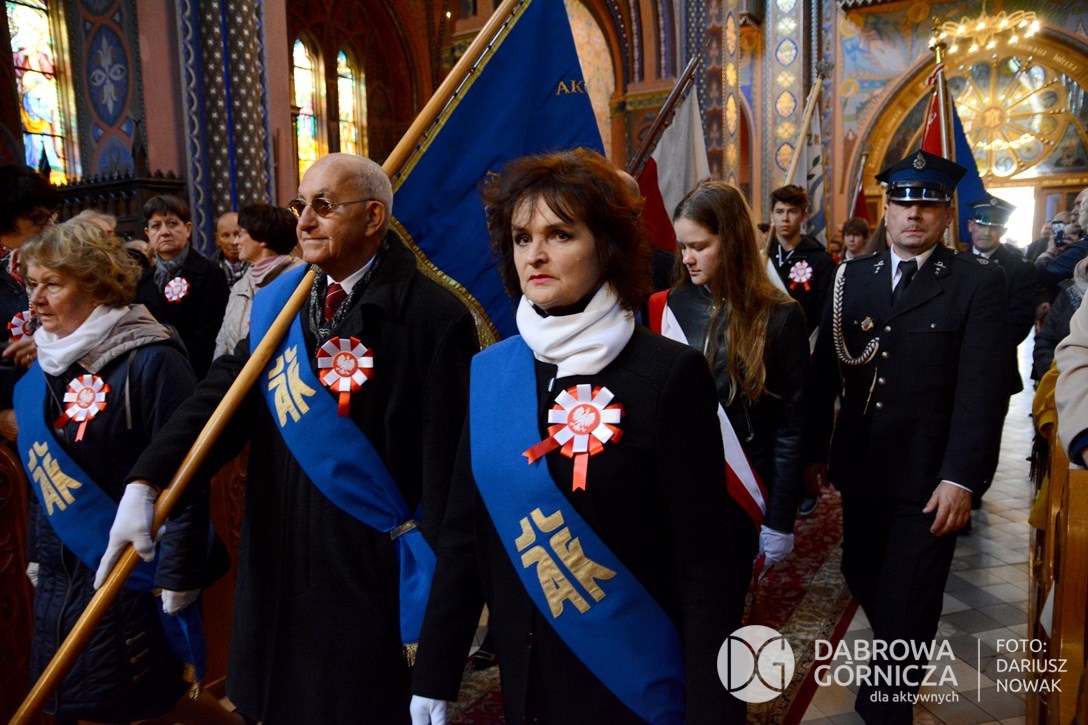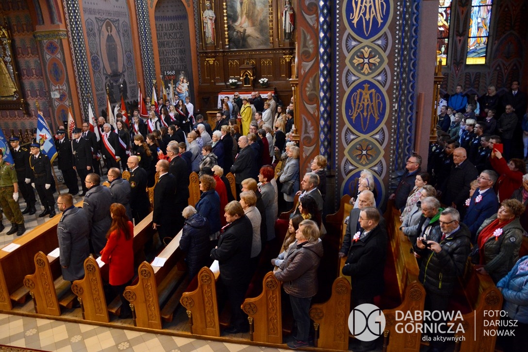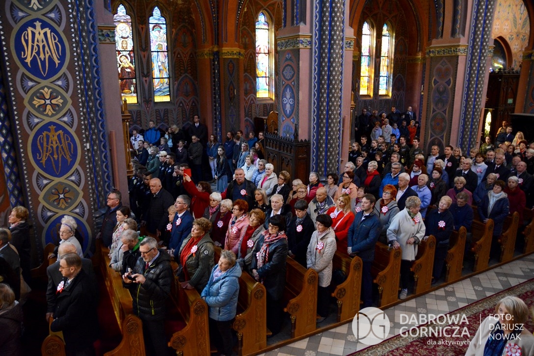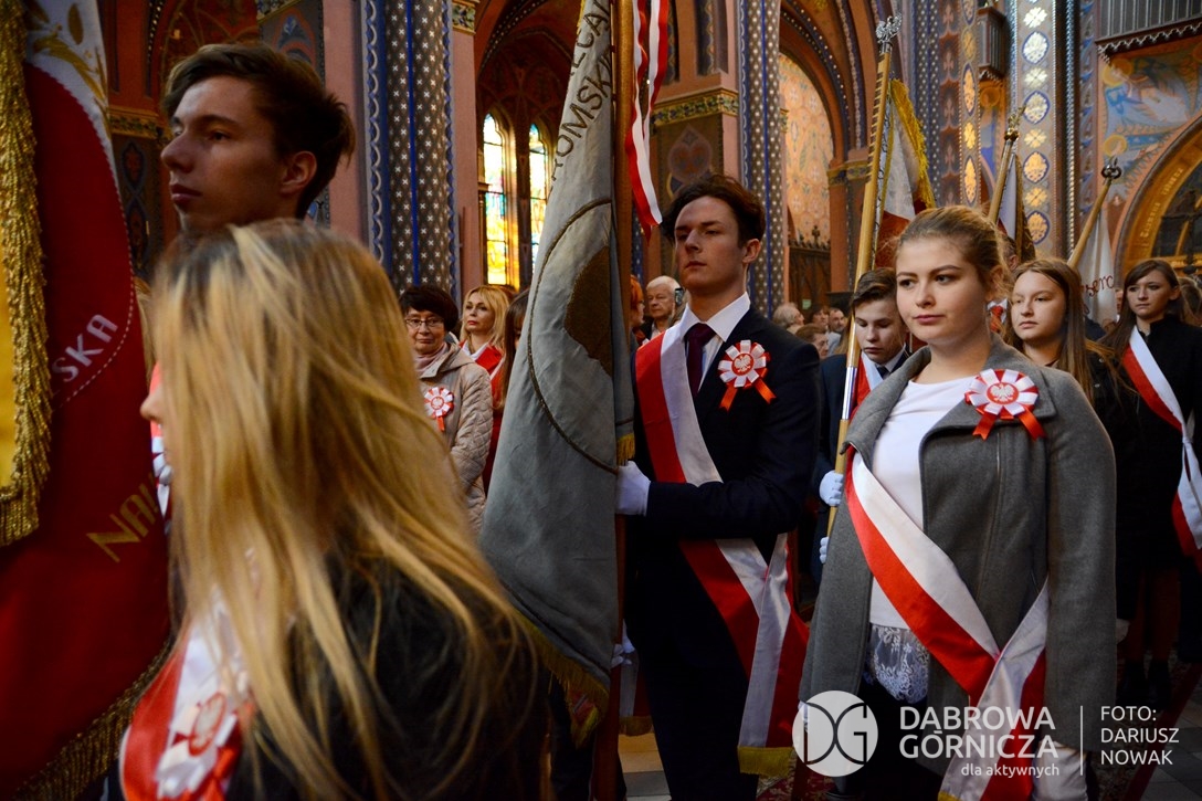 2018.11.11 Dąbrowa dla Niepodległej. Uroczysta msza w Bazylice, kwiaty na Placu Wolności, Ognisko patriotyczne i inne. FOTO: Dariusz Nowak (nddg)