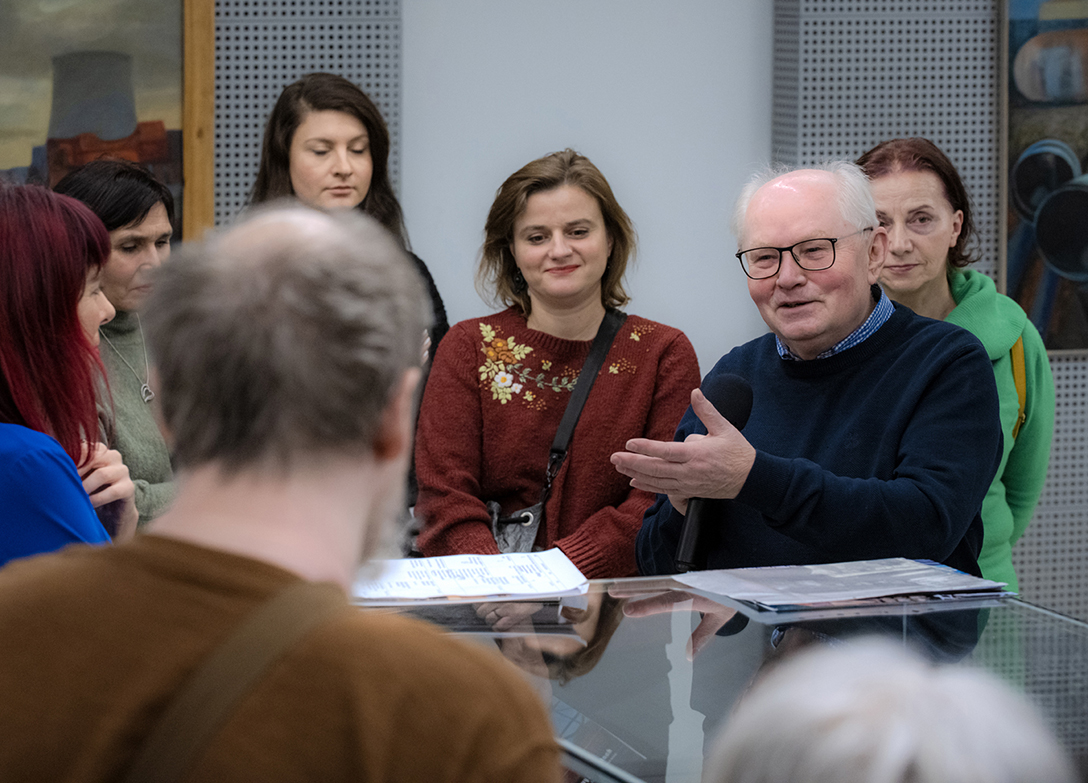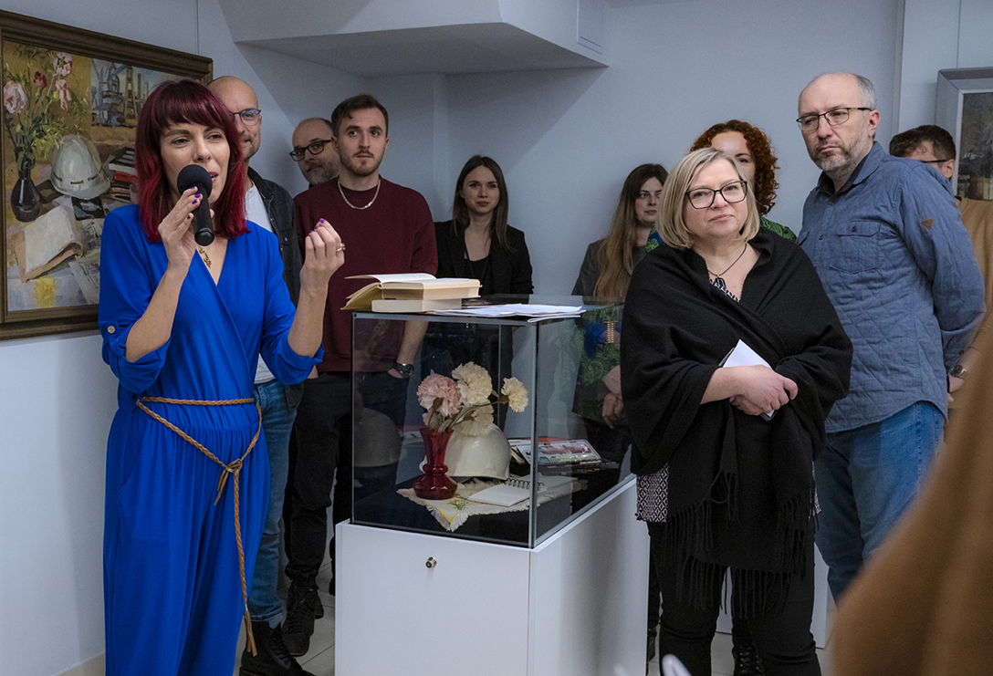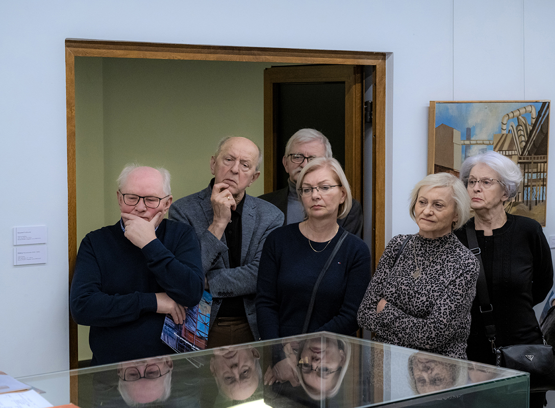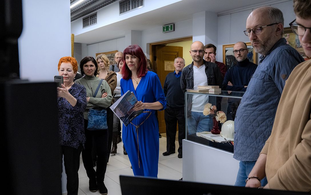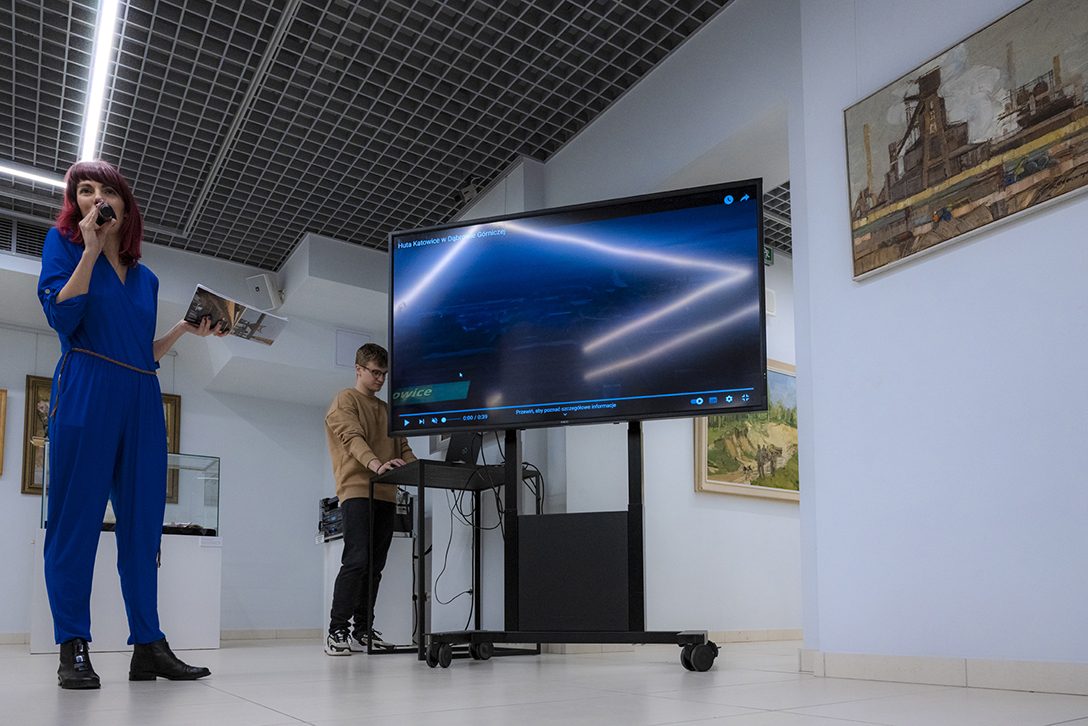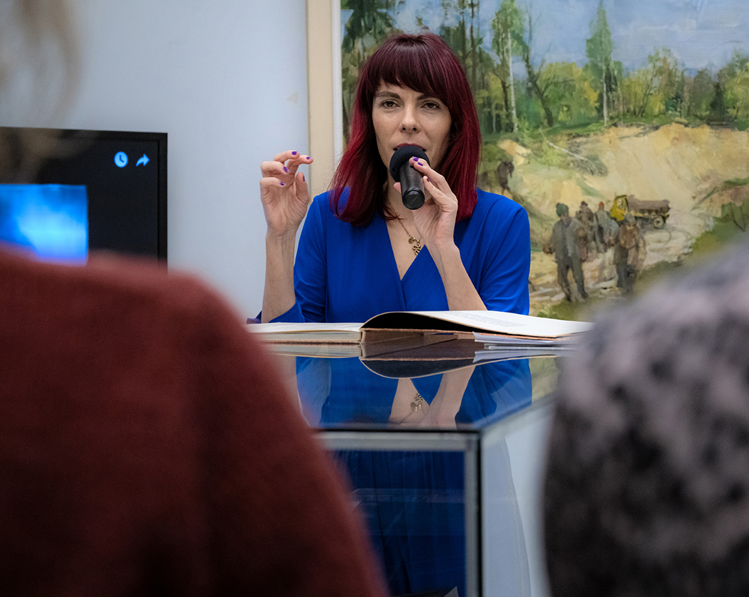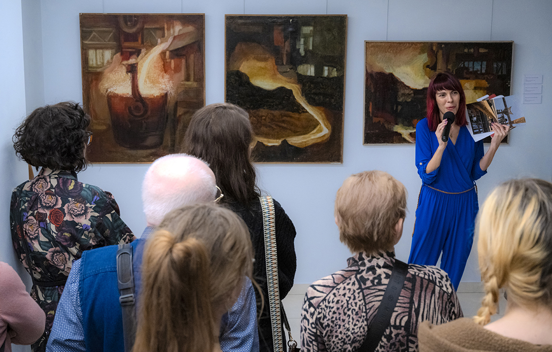 Oprowadzenie po wystawie „Artyści i Alchemicy. Huta w Tworzeniu” z autorką powieści „Ciało Huty” – Anną Cieplak oraz spotkanie autorskie w Piwnicy Teatralnej, moderowane przez Magdalenę Cyankiewicz – kustosz Muzeum Miejskiego „Sztygarka”. Fot.: M. Wesołowski