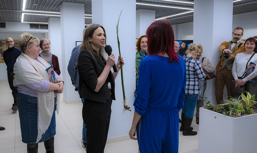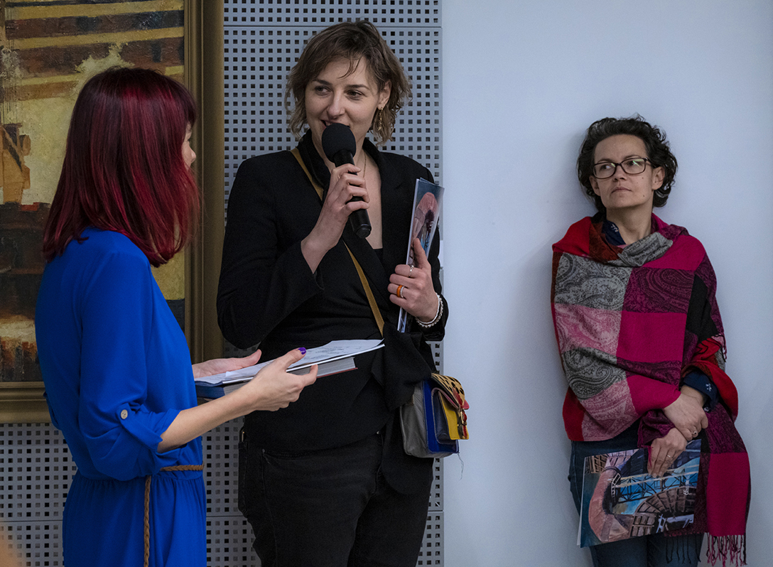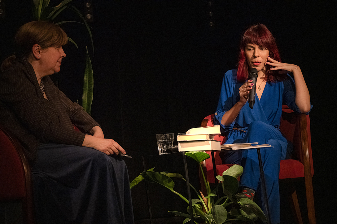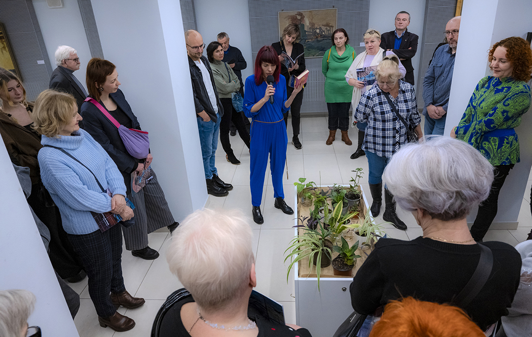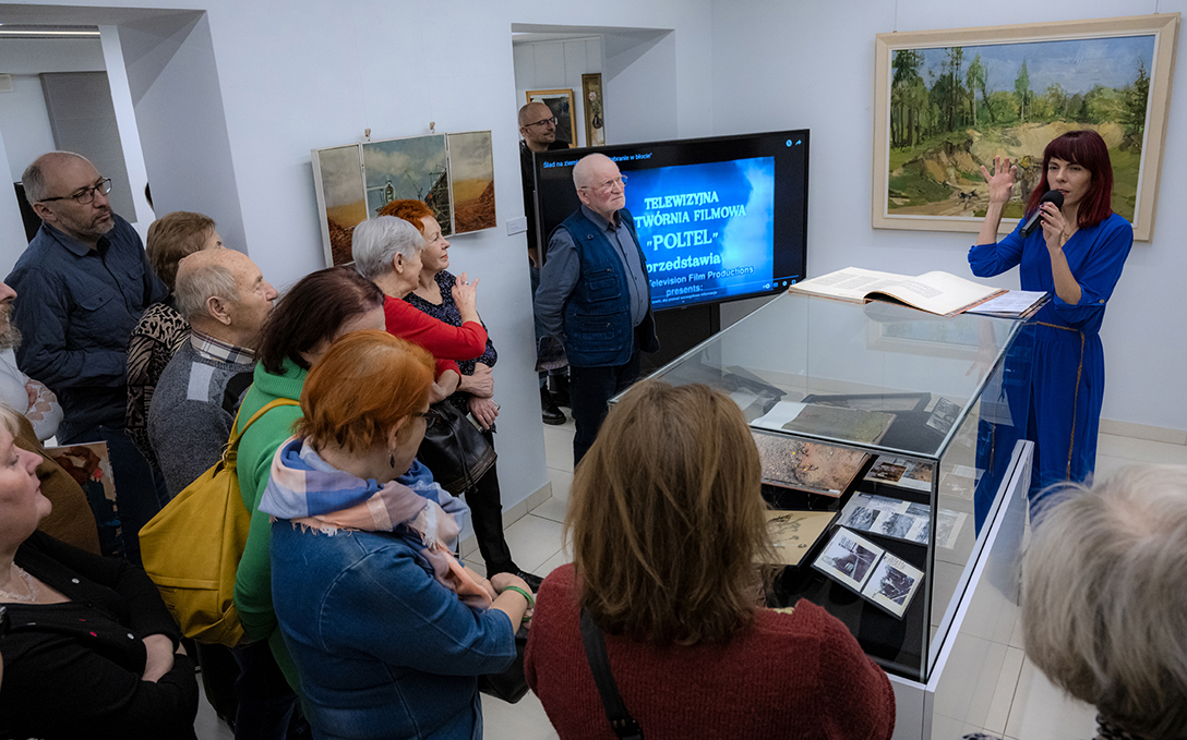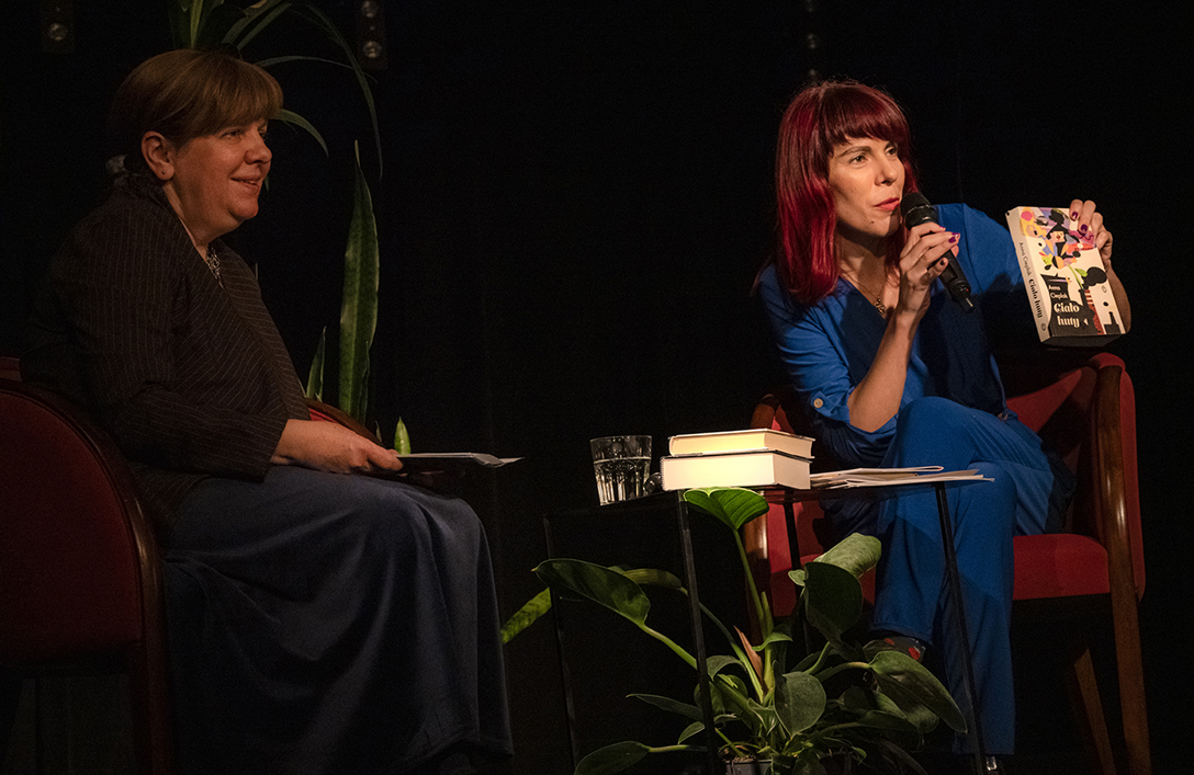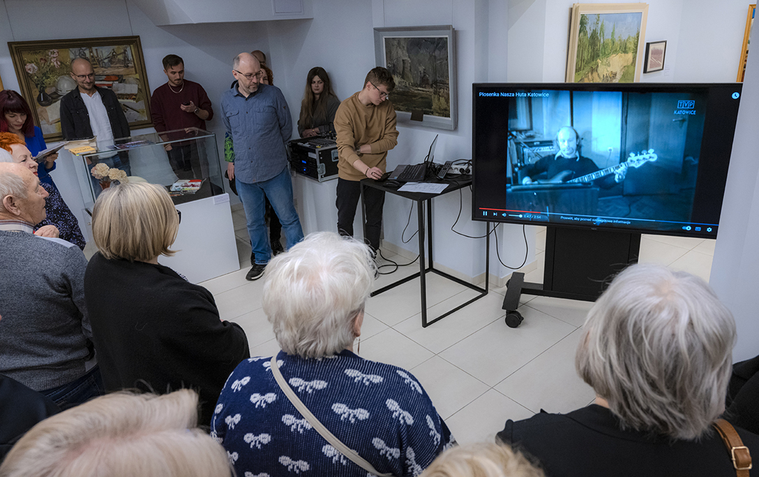 Oprowadzenie po wystawie „Artyści i Alchemicy. Huta w Tworzeniu” z autorką powieści „Ciało Huty” – Anną Cieplak oraz spotkanie autorskie w Piwnicy Teatralnej, moderowane przez Magdalenę Cyankiewicz – kustosz Muzeum Miejskiego „Sztygarka”. Fot.: M. Wesołowski