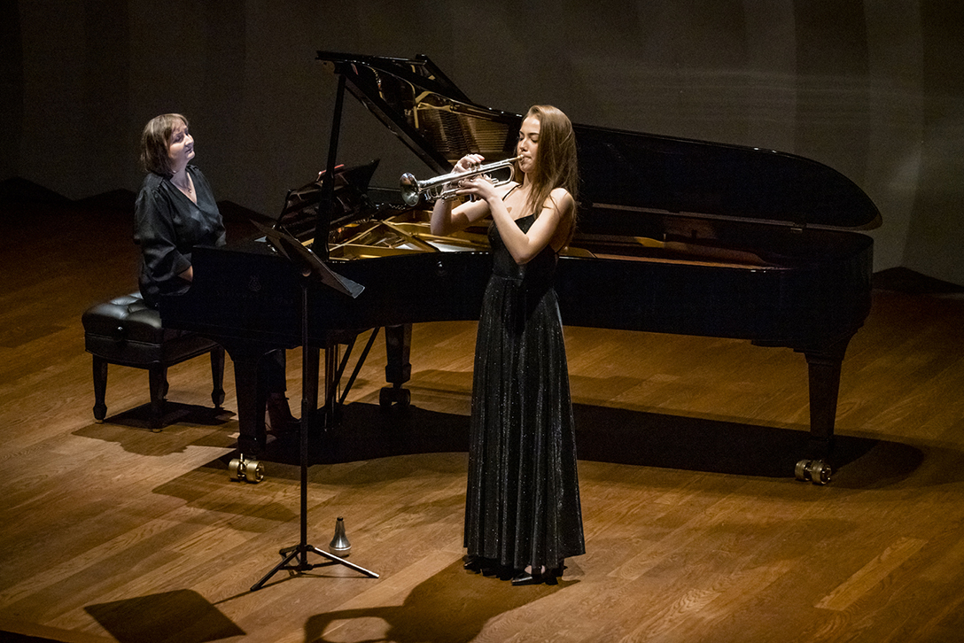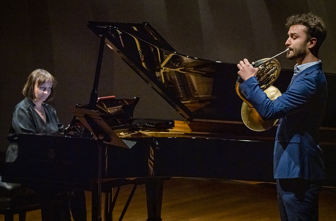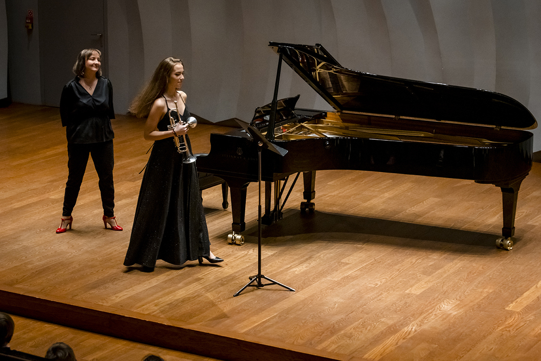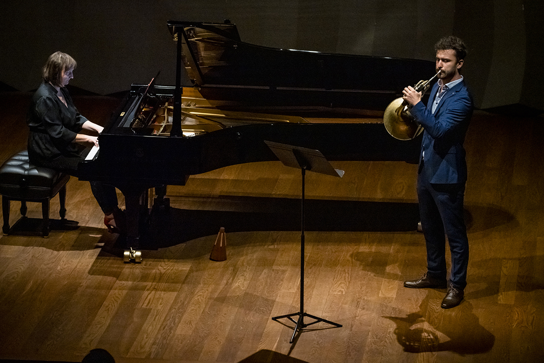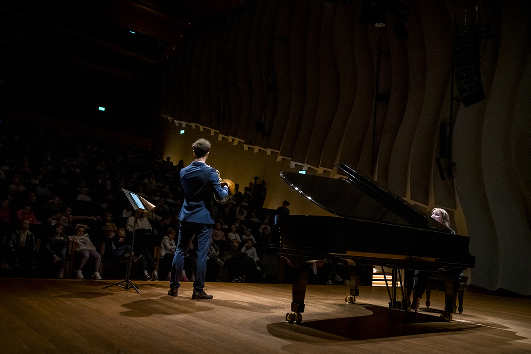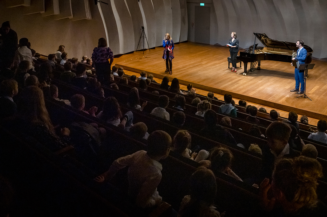 02.10.2024 r. Koncert z cyklu „Kalejdoskop” – dla dzieci i młodzieży szkolnej oraz seniorów, w Sali Kameralnej NOSPR w Katowicach. Solistami koncertu są laureaci 14. MKM im. Michała Spisaka: Amelia Kowalewska – trąbka i Daniel Schimmer – róg, a na fortepianie towarzyszy im Anna Czaicka – Jaklewicz – akompaniatorka MKM im. M. Spisaka. Fot.: M. Wesołowski