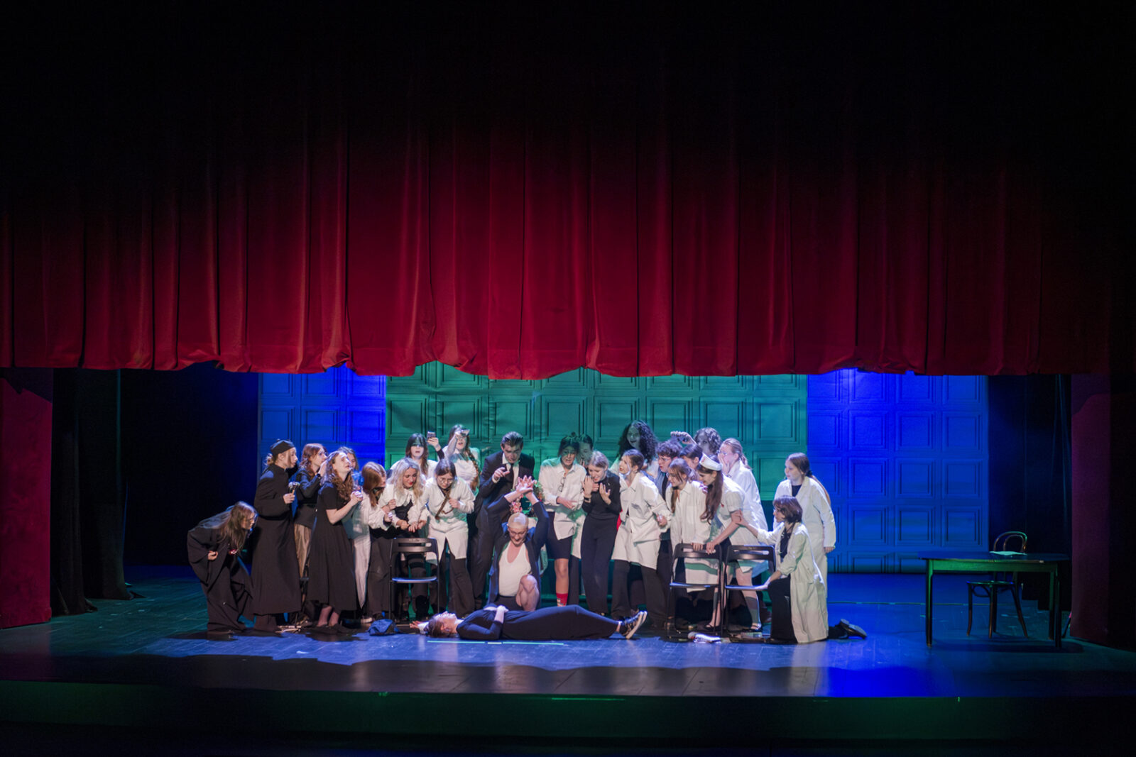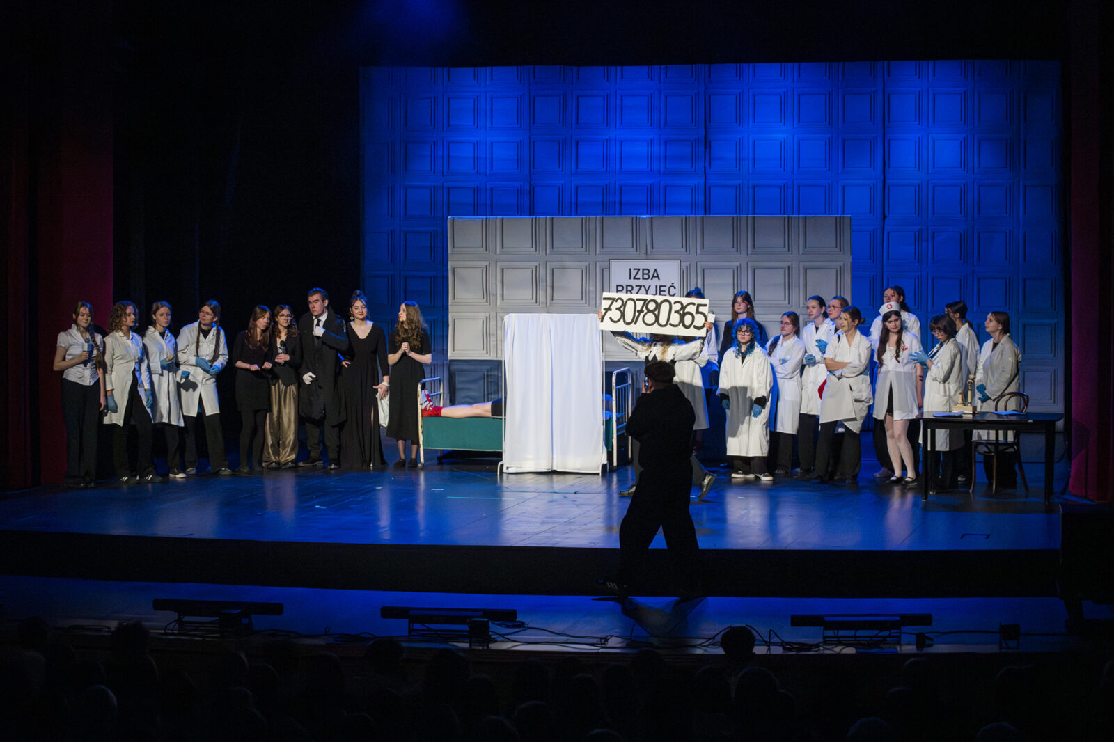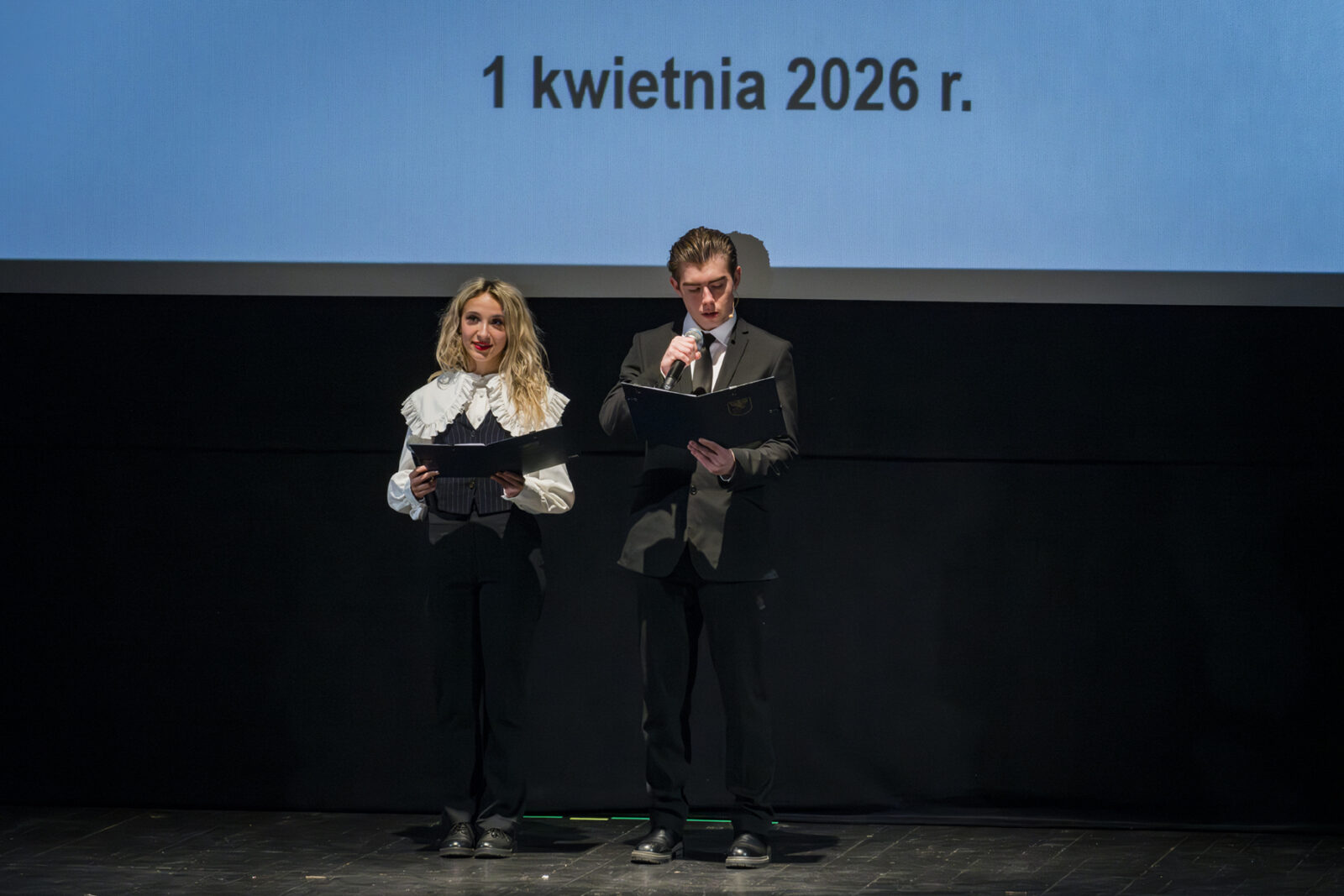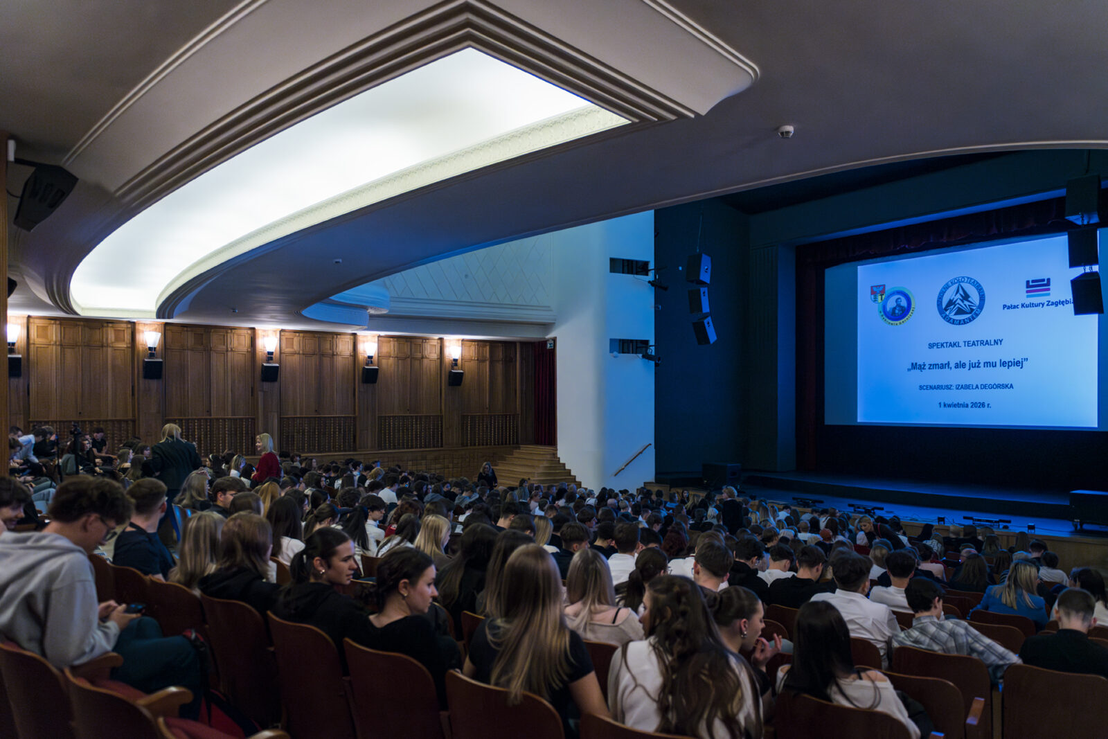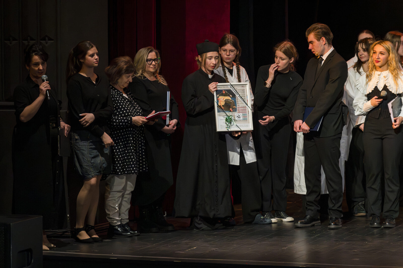 01.04.2026 r. – groteskowy humor i satyryczne zacięcie w czarnej komedii obnażającej małomiasteczkową mentalność w pogoni za sensacją. Szkolne Koło Teatralne „Adamantem” pod kierownictwem Ewy Pawik. Fot.: M. Wesołowski