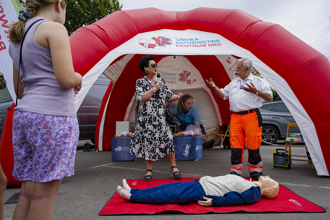 19.05.2024r. – Nauka pierwszej pomocy, sprawdzenie refleksu, symulator zderzeń i dachowania i wiele innych atrakcji podczas rodzinnego pikniku na parkingu przy Pogorii III . Fot.: M. Wesołowski