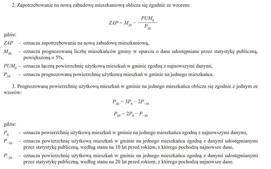 Określenie zapotrzebowania na nową zabudowę mieszkaniową w gminie (ZAP) to jeden z najważniejszych elementów planu ogólnego. ZAP mówi o tym dla ilu nowych mieszkańców można wyznaczyć w gminie tereny zabudowy mieszkaniowej. Wzór na obliczanie ZAP podany jest w rozporządzeniu. Uwzględnia on średnią powierzchnię mieszkania na jednego mieszkańca oraz prognozowaną liczbę mieszkańców w perspektywie 20 lat: